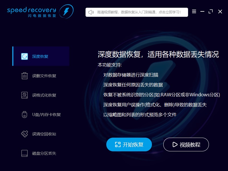 1、闪电数据恢复软件 点击立即下载 可以有效解决各种人为误操作引起的文件、数据丢失问题!比如:误删除文件、误清空回收站、误格式化分区、误分区、误Ghost、重装系统等。